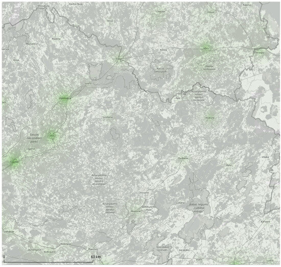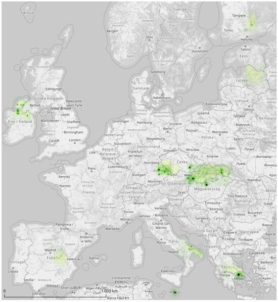 The output of the attractiveness assessment for the PoliRuralPlus pilot areas is a map (Figure 2) that compares the attractiveness in each pilot region. From a cartographic point of view, this is a so-called heatmap (density raster). The dark-green color on the map shows areas with high attractiveness (the maximum attractiveness has a value of 7906 relative points; the lowest attractiveness is 0). On the other hand, areas where the underlying map is hardly covered by the heatmap layer are the least attractive in terms of the evaluated topic.