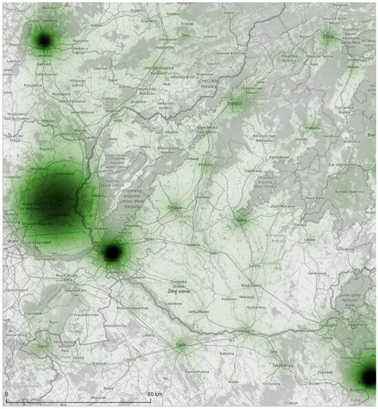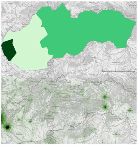 Very high attractiveness (according to Table 2) in the surveyed areas is mainly shown by the capital cities, such as Athens (Greece), Bratislava (Slovakia), Budapest (Hungary), or Valletta (Malta), or local metropolises, such as Brno (Czechia) or Regensburg (Germany); see the example in the Slovakia pilot area (Figure 3). Slovakia, except for the capital Bratislava, shows low attractiveness in comparison with urban areas in neighboring countries (Austria, Czechia, and Hungary). In the large settlements, we can find infrastructure (universities, research organizations, transport infrastructure) that strongly influences the innovation potential of the whole area.