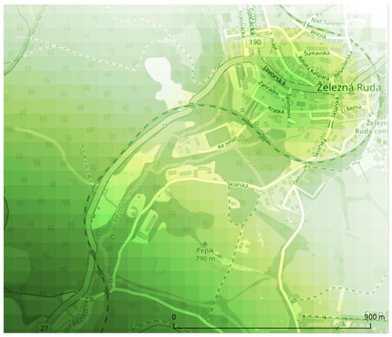 The results of a data-driven attractiveness assessment are not only useful for comparing the attractiveness of different regions. Since the proposed procedure eliminates the bias resulting from the use of statistical data and administrative region boundaries, the proposed procedure is important for regional and micro-level spatial planning (Figure 6). Since the pixel size can be set to a relatively small size in the order of tens and thousands of meters in the Heatmap function, local maxima and minima of attractiveness can be revealed. These locations can then serve as inspiration for further development or, in the case of minima, as locations with a high preference for investment, public support, and further development.