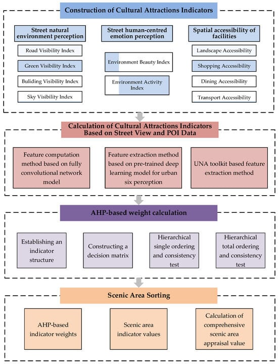 The structure of this article is as follows: Section 2 introduces the evaluation framework for the streetscape quality of historical and cultural scenic spots. Section 3 describes a ranking study conducted using Yanta District in Xi’an, China, as an example. The fourth section provides further analysis of high- and low-potential scenic spots. The last section summarizes the whole study.