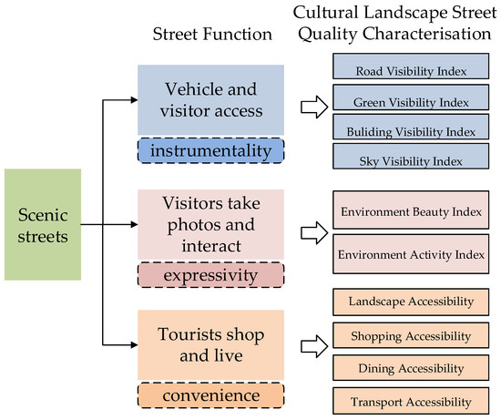 To measure the quality of streets in historical and cultural scenic spots, this study constructs a set of multidimensional and comprehensive indicator systems and determines them from three dimensions, as shown in Figure 2. On scenic streets, there are three important street space functions: instrumental, expressive, and convenience [18]. The instrumental dimension ensures the smooth passage of vehicles and tourists, the expressive dimension reflects tourists’ perception of the scenic space, and the convenience dimension serves to meet tourists’ daily needs in the scenic area, such as shopping and eating. [19].