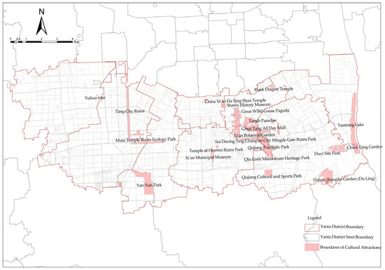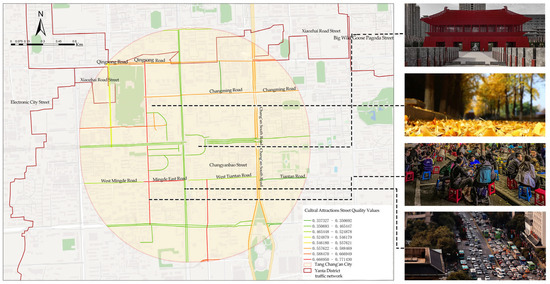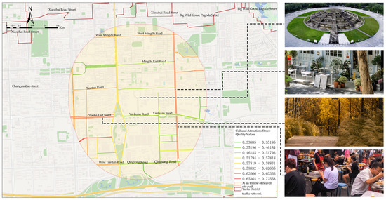 The construction and development of cultural attractions can be supported by spatial planning and design [14]. Through careful planning and design, streets in cultural attractions can create distinctive spatial atmospheres and experiences that attract the attention of tourists and social media [8,15]. In Gil et al. [16], POI data was collected in three urban centers in Seoul using major Korean portals containing search engines to explore the relationship between POIs and urban elements. Liu and Neisch [17] measure the impact of street renewal design on visitor experience through visual preference surveys, deep learning techniques, and eye tracking.