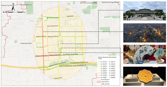 This paper assesses the quality of cultural scenic spots from the perspective of street space and comprehensively applies POI data, road network data, and streetscape data to assess cultural scenic spots in terms of natural environment perception, humanistic emotion perception, and spatial facility accessibility of streets, and at the same time, it combines these data with AHP to rank the scenic spots. The method of this paper is applied to Yanta District in Xi’an City, China, where 21 selected cultural scenic spots are evaluated and ranked, and the high-potential scenic spots are determined and analyzed in detail. First, the optimization of the scenic area’s natural environment not only enhances the visual recognition of the scenic area but also provides a more comfortable and beautiful experience for tourists, which, in turn, strengthens the external image of the brand. Secondly, the improvement of humanistic emotional perception enhances the tourists’ emotional sense of belonging to the scenic spot and promotes the deep recognition of the brand image. The improvement of spatial accessibility further enhances the convenience and service level of the scenic spot, makes the overall experience of tourists smoother, and injects more functional value into the brand image. For RQ1, we successfully constructed a set of comprehensive and effective evaluation index system, which realizes the quantitative assessment of the street quality of cultural scenic spots and provides a powerful tool for related research and practice activities. For RQ2, based on the constructed evaluation index system, we evaluated and ranked 21 cultural scenic spots in Yanta District, Xi’an City, China. Through the methodology and analysis of this paper, targeted recommendations are made on how to build high-quality cultural attractions and how to enhance the street quality potential of existing attractions. First of all, when planning and designing cultural scenic spots, the importance of street quality should be fully considered and incorporated into the overall design framework. A comprehensive evaluation index system should be applied to pre-assess the design scheme to ensure that street quality is optimized at the design stage. For policy makers, they should encourage and support cultural attractions to improve the quality of streets, such as by providing financial subsidies, tax incentives, and other incentives. They should also strengthen supervision and evaluation to ensure that the street quality of cultural attractions meets the relevant standards and requirements.