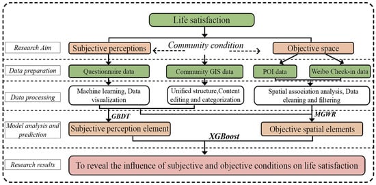 In sum, our research not only fills a crucial void by reconciling subjective and objective analyses but also offers actionable insights for more precisely targeted urban regeneration policies. The structure of this paper is as follows (see Figure 1): Section 2 reviews the literature on subjective perception and built environment factors affecting life satisfaction and identifies current research gaps. Section 3 details the research design, data sources, and case study methodology. Section 4 presents the MGWR and GBDT analysis results, emphasizing how subjective and objective spatial conditions interact to shape life satisfaction. Section 5 constructs an integrated predictive model based on XGBoost, systematically examines the policy implications for urban regeneration, and offers concrete policy recommendations grounded in empirical data. Finally, Section 6 summarizes the key findings and outlines directions for future research.