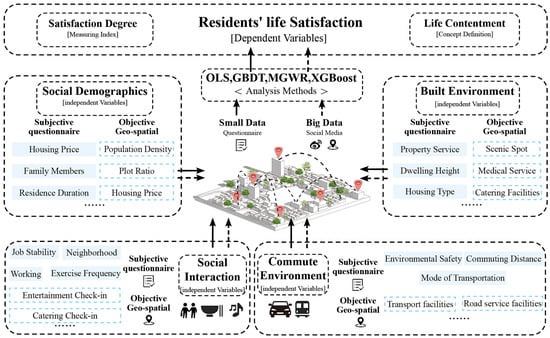 Structure Description: Our framework integrates subjective survey data (“small data”) with objective geographic “big data” (e.g., POIs, geotagged data like Weibo check-ins from social media platforms) and social demographics, thereby capturing the multidimensional facets of urban conditions. Methodologically, it visualizes spatial distributions of life satisfaction via graded mapping using GIS and quantifies spatially varying relationships between built environment factors and life satisfaction with MGWR. It then identifies nonlinear interactions among subjective factors—such as social interaction and commuting stress—using GBDT and further refines predictive accuracy through XGBoost, which synthesizes nonlinear patterns from GBDT and spatial effects from MGWR.