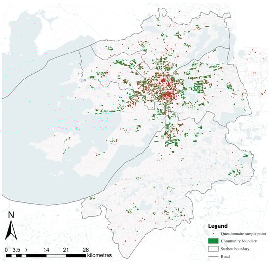 Figure 3 illustrates the distribution of questionnaire sample points across Suzhou, highlighting the various community boundaries within the city. This map, which includes urban districts like Gusu, Suzhou Industry Park (SIP), Suzhou New District (SND), Xiangcheng, Wujiang, and Wuzhong, offers a visual representation of the distribution of residents’ life satisfaction samples. The green areas represent community boundaries, while the red sample points correspond to survey responses from residents in those communities. This dynamic urban landscape makes Suzhou an ideal case for examining the factors influencing life satisfaction, particularly given its complex socio-spatial environment [86,87].