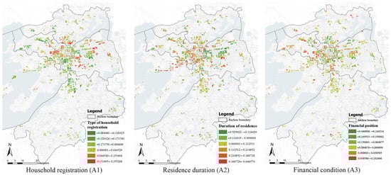 After conducting the global Moran’s I test and OLS regression analysis, we proceeded with MGWR based on subjective perception data. The results revealed significant spatial heterogeneity across personal attributes, built environment, and commuting conditions with life satisfaction. Regarding the relationship between personal attributes, the MGWR analysis retained household registration type, residence duration, and financial condition as significant factors influencing life satisfaction. The color scale in MGWR figures has been defined as follows: green represents negative correlations, with deeper shades of green corresponding to significant negative values in the region. Red represents positive values, with deeper shades of red signifying significant positive correlations.