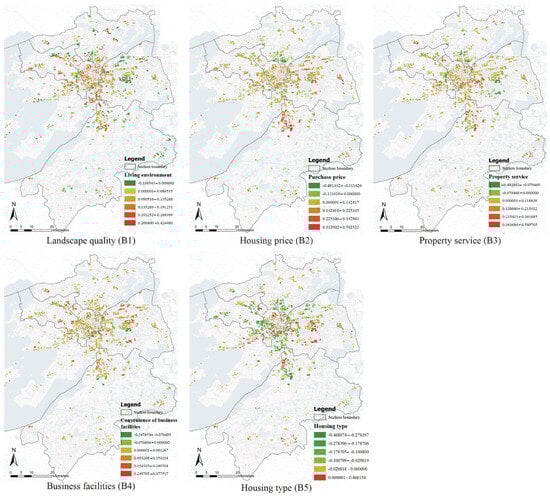 Table 5 presents the results of the OLS regression, identifying 11 key variables for further analysis in the MGWR model. The findings reveal that housing type, financial condition, and motorized commuting time significantly reduce life satisfaction. Increased vehicle ownership and prolonged commutes worsen traffic congestion and commuting experiences, lowering overall well-being. Policies that expand public transportation and shorten commuting times could mitigate these negative effects. Conversely, household income, housing price, property service quality, business and public facilities, environmental safety, and transportation mode exhibit a positive correlation with life satisfaction. Higher income and rising property values often signal improved living standards, fostering greater satisfaction. Well-managed properties, accessible business facilities, and enhanced public infrastructure meet higher-order urban needs, reinforcing overall well-being. By leveraging MGWR, this study overcomes the spatial homogeneity constraints of OLS, capturing localized variations in life satisfaction determinants. The model quantifies nonlinear thresholds, offering a spatially explicit decision-making basis for targeted urban regeneration and policy interventions.