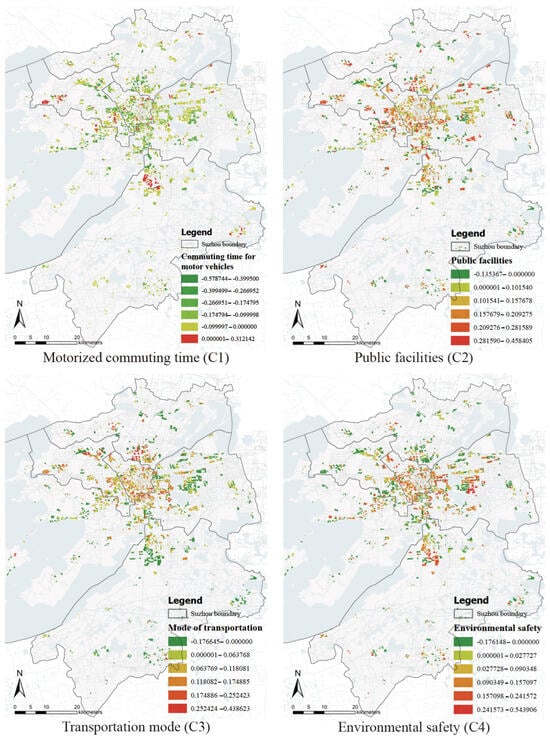 In the Gusu area, an improvement in transport accessibility (+15%) paradoxically coincides with a decline in satisfaction (Figure 6(C3)). A spatial lag model attributes this to “commuting distance elasticity”—where transportation upgrades induce suburban sprawl, increasing the average commuting distance by 2.7 km and validating the “induced demand trap” in traffic dynamics. Additionally, environmental safety shows a robust positive effect in Gusu but only a weak correlation in migrant-concentrated zones (Figure 6(C4)). This discrepancy likely arises from a “visibility bias” in safety resource allocation—where a negative spatial association between surveillance density and population mobility results in a misalignment between actual safety improvements and perceived security among vulnerable groups.
