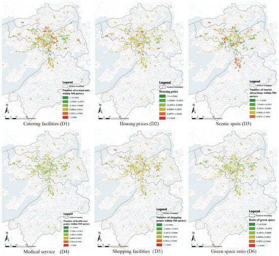 The global Moran’s Index is denoted as , where n represents the number of observations corresponding to the communities selected in Suzhou. and represent the observed values for the -th and -th communities in Suzhou, and represents the observed values for communities selected in Suzhou. signifies the spatial weight between the observations of the -th and -th communities, and is the sum of all spatial weight vertical .