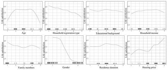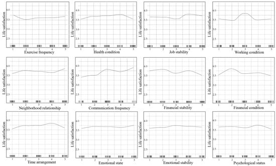 Examining life satisfaction demands a nuanced understanding of the nonlinear relationships between various influencing factors [47]. Recent studies have identified key elements such as income, age, and mental health, which exhibit nonlinear effects on well-being [48,49,50]. For instance, income has a diminishing marginal effect on life satisfaction, meaning that after a certain threshold, increases in wealth bring progressively smaller gains in happiness [51]. Similarly, the initial increase in green space significantly improves well-being, but beyond a certain point, additional greenery yields diminishing returns [52]. These findings suggest that the relationship between life satisfaction and its contributing factors is far more complex than linear models suggest.