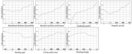 Housing conditions, a critical component of the built environment, also exhibit nonlinear effects on life satisfaction. Studies show that improvements in living environments initially lead to marked increases in satisfaction, yet these effects gradually diminish over time [53,54]. This aligns with Maslow’s hierarchy of needs, which posits that once basic housing needs are met, individuals’ focus shifts to higher-order needs, such as social belonging and self-actualization [55]. The relationship between housing factors like space and cost similarly reflects diminishing returns, suggesting that while larger living spaces or higher housing prices may initially boost satisfaction, beyond a certain point, these benefits taper off.