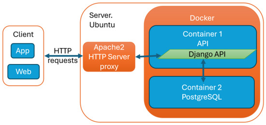 The data are stored in the PostgreSQL + PostGIS database. The Django framework takes care of the communication with the database and the data analysis algorithms. The server operating system is Ubuntu 22.04. Docker is used to build two containers, one for the database and the other for the Django (Application Programming Interface) API. Currently, the system has a Two-tier Architecture, but thanks to Docker, the system can easily be scaled up and converted to an N-tier Architecture [69]. Both the web and the mobile application were developed with the Angular framework. In the case of the mobile application, Capacitor has been used to access the resources of the mobile device on Android. The app uses an SQLite database to store the data on the device.