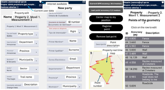 The data managed by the app follow the Cadastral Survey model LADM-COL V2, which manages the following data: property data, stakeholder data, property polygon, and boundary points. For each point, a different description and GPS accuracy are stored. Figure 2 shows the app’s main screens.