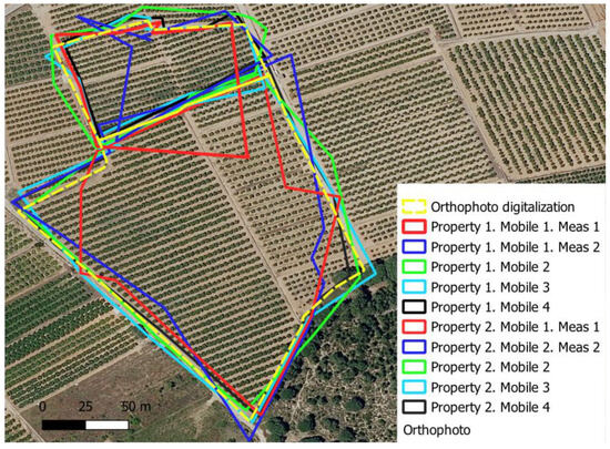 The app shows the real -time accuracy of the GPS. An accuracy better than 20 m was always waited for before the points were registered. As can be seen in Figure 3, three mobiles out of four (mobile numbers 2, 3, and 4) measured with sufficient accuracy to identify the boundaries of the properties in the base map, which is the intended objective. The base map is an orthophoto, scale 1/5000, with a theoretical accuracy of 1 m. One of the mobiles, mobile 1, in the first measurement (red colour in Figure 3) gave very poor results. For this reason, the two properties were measured again with mobile 1, changing some settings. Battery saving was removed in the app, because GPS takes a considerable, and variable, time after powering up before it delivers a good position measurement, to obtain the best accuracies as soon as possible [76]. The option to use precise location was also enabled, which uses other data, such as WiFi networks, mobile phone antennas, gyroscopes, and accelerometers, to increase the accuracy obtained with GPS. The result was just as poor as in the first measurement (the blue line in Figure 3). Throughout, GPS accuracy was very erratic on this mobile, with no explanation found.