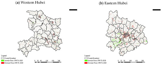 Using ArcGIS software, the habitat quality index maps of the study area for 1990 and 2020 were overlaid to obtain the habitat quality index change map from 1990 to 2020 (Figure 6). The results show that over the past 30 years, changes in habitat quality in the study area are mainly concentrated in the eastern part of Hubei Province, and the proportion of areas with decreasing indices is greater than that of areas with increasing indices; areas with degraded habitat quality are clustered in Wuhan and its surrounding economically developed areas, and areas with improved habitat quality include Honghu, Xiantao, Hanchuan, and Huangmei. Habitat conditions are more stable in the western part of Hubei Province, with Yichang City being the main area of change. Spatially, variations in habitat quality changes can be observed in the study area.