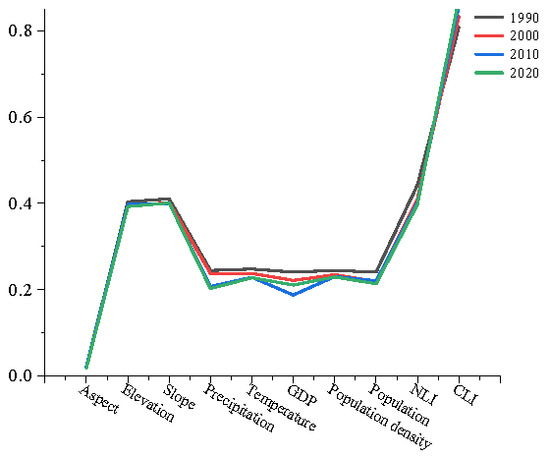 Changes in the five categories of threat factors in Hubei Province from 1990 to 2020.