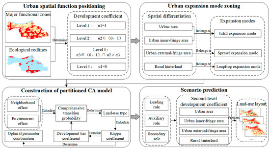 As shown in Figure 1, this study was divided into four parts: (1) Delineation of urban spatial functional zones. Based on major functional zones (MFZs) and ecological redlines, urban spatial functional units were determined, and development coefficients were defined to reflect functional differences. (2) Delineation of land expansion mode zones. Based on the spatial heterogeneity of urban development modes, the scopes of infill, sprawl, and leapfrog expansion modes were delineated. (3) Urban expansion simulation. Combining functional zoning and expansion mode zoning, the evolution process of urban land expansion was simulated using the principles of the CA model. (4) Multi-scenario design and simulation. By adjusting second-level development coefficients in the expansion model, multiple expansion scenarios were designed to predict changes in urban land-use patterns under different expansion modes.