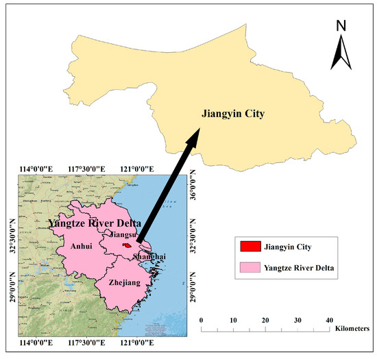 Jiangyin City, located north of Wuxi in Jiangsu Province and adjacent to the East China Sea, with the Yangtze River to its north and Taihu Lake to its south, occupies a crucial position within the Yangtze River Delta economic zone (Figure 2). The unique location not only provides an extensive transportation network for Jiangyin City, but also transforms it into a transportation junction connecting the north to the south and the east to the west. Swift economic advancement and the enlargement of the urban area, coupled with other factors, have rendered Jiangyin City a setting characterized by varied spatial functional layouts and complex land expansion modes during urbanization. Therefore, we selected Jiangyin City as the focus of this investigation, aiming to determine the underlying patterns and future tendencies of its urban land expansion, thereby providing scientific insights for urban planning and governance.