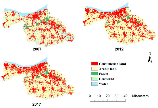 Here, a method for the expansion of urban land use was developed using land-use data from 2007, 2012, and 2017 from Jiangyin, ecological redline data, and MFZ data (Figure 3 and Figure 4). Notably, the MFZ data specifically pertain to the year 2012. Additionally, spatial distribution, transportation network, and digital elevation model data from Jiangyin City and its county center served as auxiliary data. This methodology allowed the simulation and prediction of changes in land use under multiple scenarios of land-use expansion.