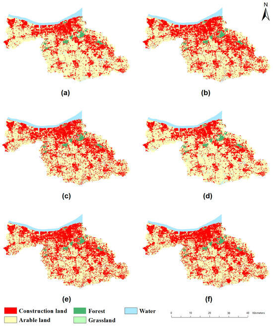 Forecast results of urban land expansion: (a) infill–sprawl–leapfrog mode; (b) sprawl–infill–leapfrog mode; (c) leapfrog–infill–sprawl mode; (d) infill–leapfrog–sprawl mode; (e) sprawl–leapfrog–infill mode; and (f) leapfrog–sprawl–infill mode.