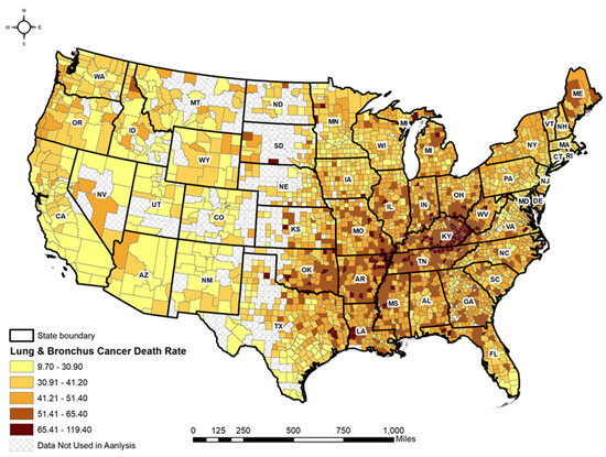 Nevertheless, the differences in lung cancer mortality rates across regions in the United States, along with the link between lung cancer and elevation, are still not fully understood. The relationship between geographic location and negative health outcomes is complex and multifaceted. Recent studies have begun to shed light on this prominent issue, investigating the disparities in various health outcomes, including lung cancer, across different geographic areas [13,14,15].