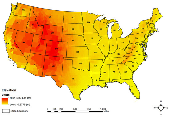 County elevation data for 3141 administrative areas within the U.S. was created by the U.S. Geological Survey [24]. The mean elevation for each county was accurately calculated using the 100 m spatial resolution of the USGS dataset. Zonal statistics within the ArcGIS 10.5 were utilized to compute the mean elevation for each county, minimizing variations in topography. This method is more reliable, even for large counties, although challenges are more pronounced when considering entire states [25] or using elevation values from the county centers [26]. The analysis included data from 3064 contiguous counties. County boundaries from the U.S. Census Bureau were used to obtain the mean county elevations in meters and the area in square miles for each county, as illustrated in Figure 2.
