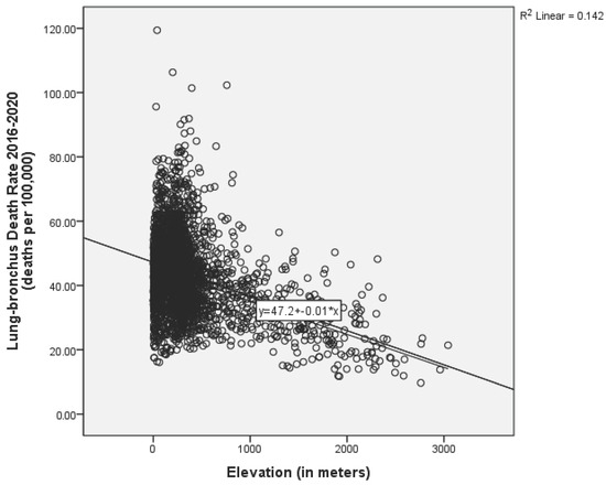 Table 1 provides the mean, standard deviations (SD), and bivariate statistics of both dependent and independent variables. For dependent variables, average age-adjusted lung and bronchus cancer mortality rate (deaths per 100,000) in 2662 contiguous counties was 43.095 with a SD of 12.320. The mean county elevation was 373.160 m with a SD of 439.119 m. For health behavior factors, on average, 18.60% of a county’s adult participants were smokers with a SD of 3.64%. Also, on average, 33.46% and 31.18% of adult participants in the counties had insufficient sleep and obesity, with a SD of 3.96% and 4.46%, respectively. Moreover, the percentage of physically inactive and the percentage of alcohol impaired were, on average, 27.40% and 30.82%, with a SD of 5.49% and 12.96%, respectively. For clinical factors, on average, the percentage of uninsured and the number of primary care physicians per 100,000 patients were 16.95% and 56.29 physicians with a SD of 5.10% and 32.42 physicians, respectively. Also, preventable hospital stays, on average, were 63.48 hospital stays per 1000 patients with a SD of 24.64. For socioeconomic factors, the percentage of adults with a college education and the percentage of unemployed adults, on average, were 56.03% and 6.46% with a SD of 11.16% and 2.12%, respectively. Moreover, the mean county association rate was 13.83 membership associations per 100,000 population with a SD of 6.78. For demographic factors, the proportion of a county’s population aged 65 and above was, on average, 17.24% with a SD of 4.10%. The African American population, on average, accounted for 9.87% of a county’s population, with a SD of 14.72%. The variations in these independent variables indicate that lung-bronchus cancer mortality occurred in counties with heterogeneous behavioral, socio-demographic, and environmental characteristics. Furthermore, Figure 3 presents a scatter plot of lung-bronchus cancer death rates with elevation to show the possible association between two variables.