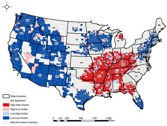 The study identified the southeastern and central United States, including states such as Alabama, Arkansas, Georgia, Kentucky, Louisiana, Mississippi, Missouri, Oklahoma, and Tennessee, as regions with the highest concentration of high lung-bronchus cancer death rates. Conversely, regions with lower rates of lung-bronchus death rates, referred to as cold spots, are primarily located in the Midwest and Western U.S, including Arizona, Colorado, Idaho, New Mexico, Utah, and Wyoming. Prior research consistently highlights that the southeastern region of the United States, also referred to as the “Stroke Belt” or the “Diabetes Belt”, is identified as the least healthy region in the country, with its residents experiencing higher risks of various chronic diseases such as obesity [37,38], cardiovascular disease [37,39], and diabetes [40]. The poor health outcomes in the southeastern United States may be linked to unhealthy behaviors, socioeconomic challenges, limited access to healthcare, and higher premature mortality [41,42].
