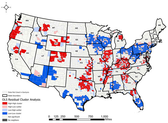 Moreover, the model residuals were spatially autocorrelated (Moran’s I = 0.113; z = 26.261; p < 0.001), meaning that the county-level lung-bronchus cancer death rates were spatially dependent across the 48 states. In addition, the residuals from the OLS model indicated that the lung-bronchus cancer death rates were underestimated primarily in the counties of southern states, including Kentucky, Georgia, Texas, and Oklahoma; and counties of western states, including Wyoming, Colorado, and Oregon (Figure 5).