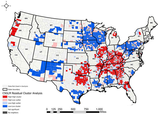 Moreover, the model residuals from the CSGLM are spatially clustered (Moran’s I = 0.175; z = 40.537; p < 0.001), indicating that the lung-bronchus cancer death rates at the county level were spatially clustered across the 48 contiguous states. Furthermore, the residuals from the model show that the lung-bronchus cancer death rates are underestimated mainly in the counties of Southern states such as Kentucky, Georgia, Alabama, Oklahoma, Texas, and Tennessee as illustrated in Figure 6.