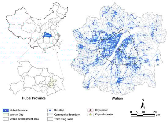 Our research focuses on the community level (Figure 1). Firstly, residential areas in China often serve as crucial anchors for different types of activities among diverse populations. Different communities not only vary in their built environments but also in their locations and social contexts, and these differences profoundly influence residents’ travel behaviors [43]. Taking Wuhan as an example, the Jianghan Road community in Hankou, located in the city center with dense commercial facilities, encourages short-distance walking and public transit use. In contrast, the East Lake High-Tech Zone in Wuchang, situated on the urban periphery, features a separation of residential and work areas, leading to greater reliance on private cars and long-distance commuting. This diversity offers a valuable empirical context for studying how the built environment shapes travel behavior. Secondly, compared to rail-based transportation, bus services have broader spatial coverage and can meet the travel needs of a wider range of communities [44]. Therefore, neglecting the intrinsic link between community planning and bus usage may significantly hinder our ability to achieve more sustainable and equitable urban transportation, necessitating further investigation.