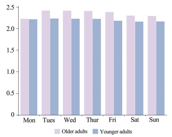 Travel frequency refers to the number of times an individual takes the bus each day. Figure 3 compares the travel frequency between older adults and young people, revealing that the travel frequencies of older adults and younger adults are quite similar. Specifically, older adults have a travel frequency of 2.37 times per day on weekdays and 2.30 times per day on weekends, both higher than the frequencies of 2.22 times per day and 2.17 times per day for the young. This contrasts with some previous studies but aligns with recent research findings, suggesting that with improved physical health and aspirations for a higher quality of life, today’s older adults are more willing to move around than their predecessors [13]. Notably, this is in contrast to the results for subway travel frequency among older adults and younger adults [12], highlighting the importance of buses for older adults’ travel. In addition, both older adults and younger adults have higher travel frequencies on weekdays than on weekends, reflecting the different impacts of daily commuting and leisure activities on travel demand.
