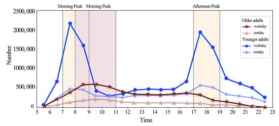 In terms of temporal and spatial distribution, there are also differences in travel patterns between older adults and younger individuals. Studies have shown that, during the morning and afternoon peak commuting hours, older adults make significantly fewer trips, indicating their tendency to avoid traveling alongside younger people. Conversely, older adults are more frequent travelers during the off-peak hours from 10 a.m. to 5 p.m. [19], and they are more active during the daytime than after dark [11]. Furthermore, although older adults are more willing to travel on weekdays than on weekends, the temporal trends in their travel remain consistent [7,26]. Spatial distribution characteristics constitute another important factor in the analysis of mobility behavior. Research conducted by Shi et al. has revealed that areas with a higher number of older adults trips are concentrated in urban centers [7], and regions where older adults are more frequently seen have a higher elderly population [27].