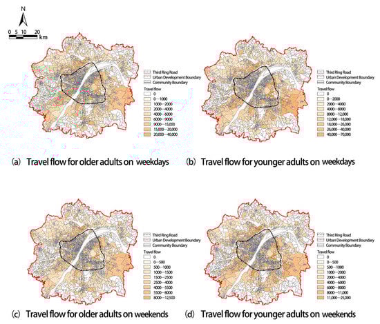 Figure 5 displays the spatial distribution of travel for both older adults and younger adults on weekdays and weekends. Overall, the travel patterns of older adults and young show similarities, with the most frequent travel activities concentrated within the Third Ring Road and distributed in an axial belt along the east and west banks of the Yangtze River, aligning with the city’s main development direction. Outside the Third Ring Road, areas with higher travel volumes also extend to the Hannan District, Hongshan District, and the Caidian area along the Yangtze River. This distribution pattern is closely related to the number of bus stops in Wuhan City. Additionally, although the travel volume of older adults on weekends is lower than that on weekdays, the spatial distribution patterns between the two remain basically consistent.