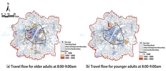 During weekdays, there is an overlap in the morning peak travel times between older adults and young people between 8:00 and 9:00. To gain a deeper understanding of this difference, we conducted a comparative analysis of their spatial distribution of travel during this time period. As shown in Figure 6, for both older adults and young, the hotspots for bus travel are concentrated within the city’s Third Ring Road and along its corridors, exhibiting a pattern of point-like distribution. On this basis, there are certain differences in their specific distributions. Specifically, compared to the young, older adults demonstrate a stronger willingness to travel by bus within the Third Ring Road, and also show higher travel activity in some communities in the Jiangxia District and Hannan District.