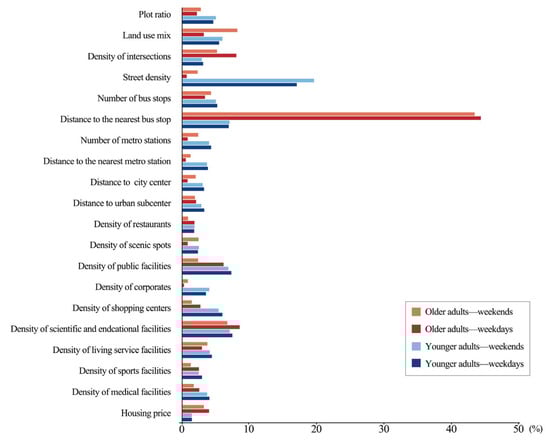 Regarding the variations between weekdays and weekends, the greatest increase in relative importance is observed for shopping amenities among elderly bus riders. Meanwhile, scenic spots and street density exhibit a significant decline in their relative importance for older adults travel during weekdays and weekends. This shift may stem from the fact that older adults are more likely to accompany their families for shopping and other activities on weekends, thereby reducing the influence of street density and scenic spots on their choice of public transport and placing greater emphasis on the convenience of shopping facilities. In stark contrast to older adults, the relative importance of the number of business facilities undergoes the greatest decrease for young people’s weekday–weekend public transport choices. Similarly, the relative importance of shopping facilities is seen to increase the most for young people during weekends. This underscores the difference in travel purposes between weekdays and weekends for young people: on weekdays, influenced by rigid commuting demands, the relative importance of the number of businesses significantly surpasses other variables, whereas on weekends, the demand for shopping facilities increases substantially [10]. Furthermore, compared to older adults, the impact of the built environment on weekday–weekend variations in bus ridership is more subdued among young people. This finding suggests that, due to changes in travel demands and physical limitations, older adults are more likely to exhibit variability due to built environment factors in their use of public transport [47].