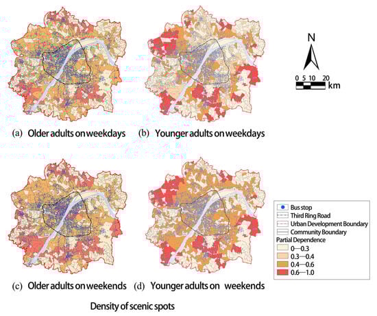 Figure A1 presents the visualization results of spatial heterogeneity in the impact of built environment factors. Overall, there are differences in the influence of built environment factors on older adults and young adults, and these influences dynamically change over time. For instance, scenic facilities have no regular impact on young adults during weekdays (Figure 8), but their influence significantly intensifies in certain areas along the Third Ring Road (such as Dongxihu and Jiangxia) on weekends, highlighting the attractiveness of these places to young adults during leisure time. In contrast, for older adults, the trend of influence from scenic facilities remains similar whether it is on weekdays or weekends, with the main impacted areas being Caidian, Huangpi, and Jiangxia, and the influence intensifies on weekends. This reflects the stability of older adults’ daily activity patterns and their different leisure preferences compared to young adults.