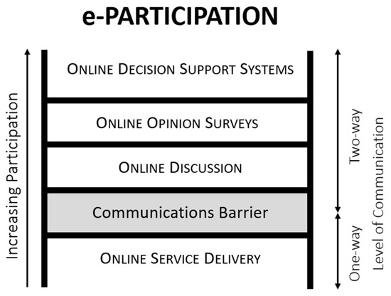 With participatory planning entering the digital era, Smyth [69] modified Arnstein’s ladder of citizen participation to an ‘e-participation ladder’ that transfers the generic levels of participation described by Arnstein [15] to a participatory planning framework with digital tools [70,71]. Figure 1 shows Smyth’s ‘e-participation ladder’ that depicts the increasing levels of participation facilitated by progressively sophisticated online planning tools [69].