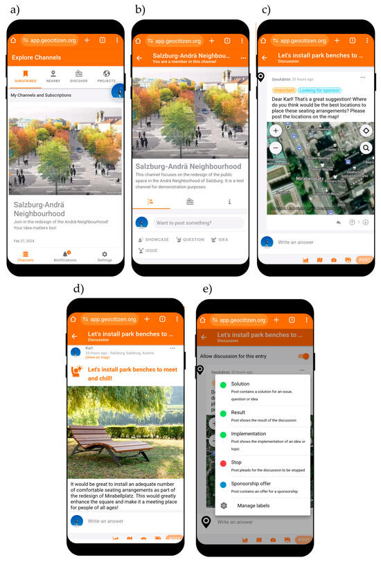 Interface of the ‘Bürgercockpit’-application in an exemplary participation process. (a) Exemplifies an overview on all user-subscribed channels and (b) shows the specific information of a channel; (c) depicts a user post in a channel including an overview map of the post content; (d) shows a user idea; and (e) depicts the progress stage of an issue (e.g., idea, etc.) to be discussed.