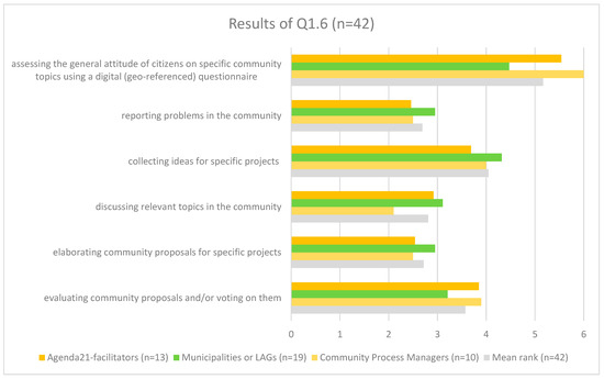 According to the feedback of the participating community stakeholders, geospatial DPPs support various tasks of a participatory planning process such as collecting ideas for specific (community) projects, evaluating community proposals and/or voting on them, or discussing relevant topics in a community (Q1.6, Q1.7). They are particularly suitable for assessing the general attitude of citizens on specific community topics through digital (geo-referenced) questionnaires for community surveys (Q1.6). Figure 3 presents the results of Q1.6 where the participating community stakeholders had to rank six typical tasks of a participatory community planning process that can be supported by a geospatial DPP according to their (perceived) importance of each task on a scale from 1 (least important) to 6 (most important). The figure presents the mean ranks for each task, based on the assessment provided by the corresponding community stakeholder groups (Agenda 21 facilitators, municipalities or LAGs, and community process managers).