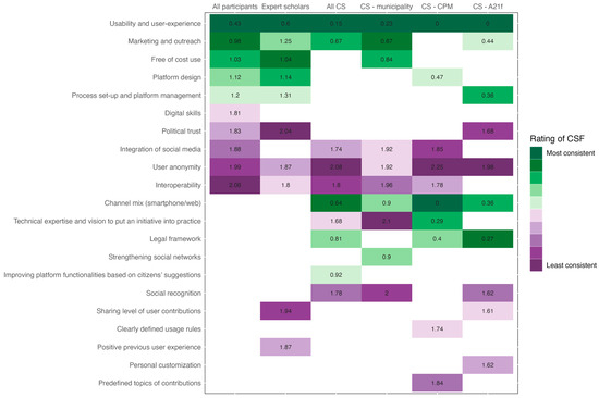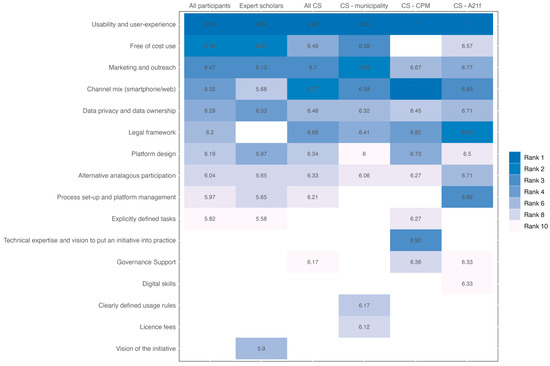 Figure 5 presents the five most consistently rated, as well as the five most inconsistently rated Critical Success Subfactors for all participants and for each target group. The participants provided the most inconsistent ranking for the following Critical Success Subfactors: digital skills, political trust, integration of social media, user anonymity, and interoperability with other platforms. The five Critical Success Subfactors that were consistently ranked highest by all participants were usability and user experience, marketing and outreach, free of cost use, platform design, and process set-up and platform management. Considering their high and consistent ranking from Q2.2 to Q2.35, as well as their positive assessment in the open-text question Q2.1, these five subfactors can be regarded as the most important Critical Success Subfactors according to the CSF-questionnaire.