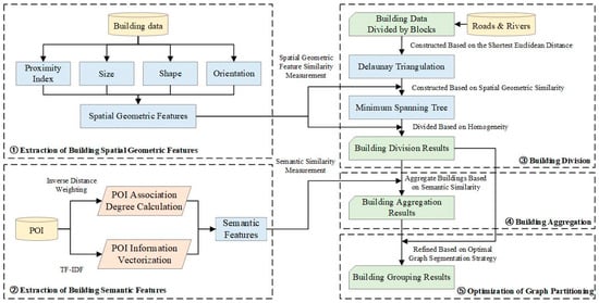 In light of this, we adopt a dual clustering strategy that integrates both top-down and bottom-up approaches. First, buildings are initially divided based on their spatial geometric features, forming preliminary groups with high spatial geometric similarity. Subsequently, these groups are further optimized according to the similarity of semantic features, ensuring that the buildings within each group are not only spatially close but also semantically similar. Finally, to address potential conflicts between spatial geometric similarity and semantic similarity, a boundary-building-reassignment method is introduced to optimize and adjust the building groups. The overall research strategy is illustrated in Figure 1.