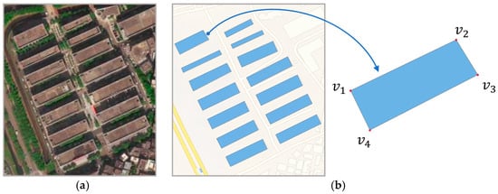 Building representation: (a) buildings in high-resolution satellite imagery; (b) building footprints as vector polygons in the vector map.