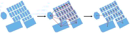 Generating a minimum spanning tree for building footprints via the Delaunay graph. The red lines represent the Delaunay triangulation (middle) and the minimum spanning tree (right).