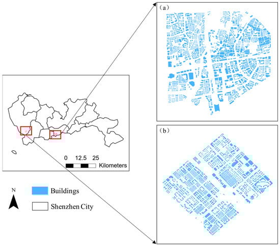Study area and building data: (a) Experimental Area I; (b) Experimental Area II.