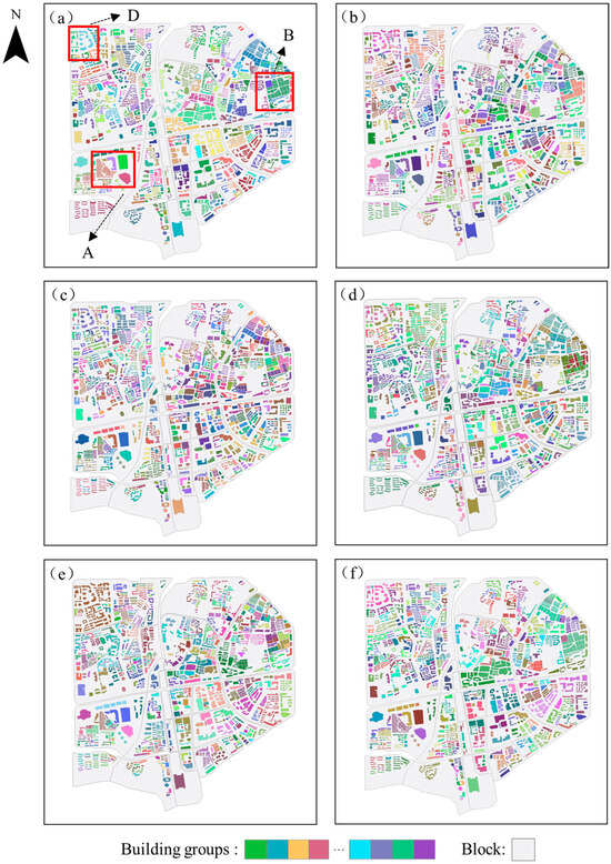 After determining the spatial geometric similarity and semantic similarity between buildings, we adopted a spatial–semantic dual clustering strategy to group buildings in two steps. In the first step, we considered spatial similarity for initial grouping, with the adjustment parameter  set to 0.9 and 0.95 for Experimental Areas I and II, respectively. Based on the initial grouping results, we then considered semantic similarity for aggregation, setting semantic similarity thresholds  to 0.6 and 0.5 for Experimental Areas I and II, respectively. Finally, we optimized the grouping results. In Experimental Area I, the reassignment threshold for isolated points was set to 1 and for non-isolated points to 1.5. In Experimental Area II, the reassignment thresholds for both isolated and non-isolated points were set to 1.5.
