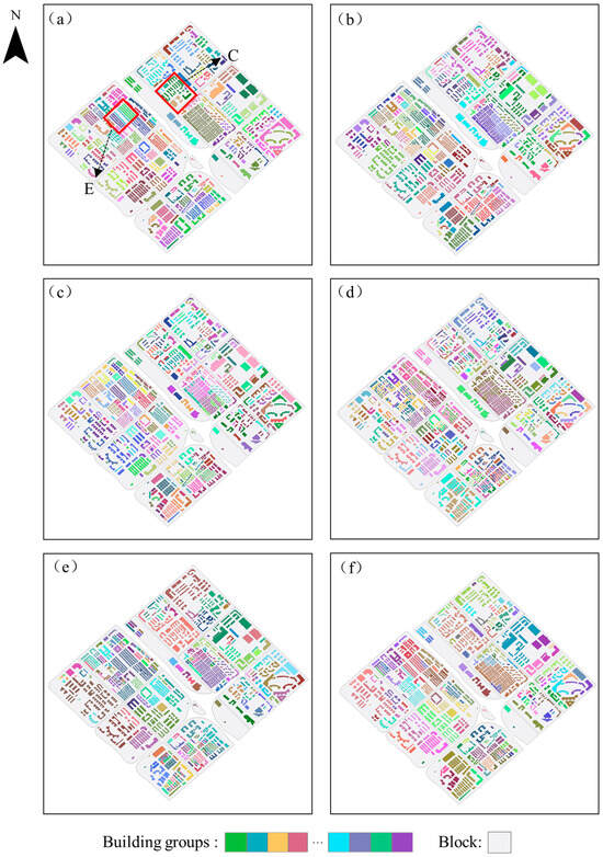 Results of building grouping in Experimental Area I: (a) reference; (b) SCMC; (c) K-Means; (d) GCN; (e) the proposed method based solely on spatial geometric similarity; (f) the proposed method.
