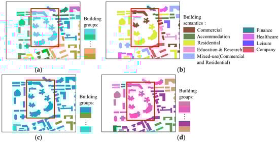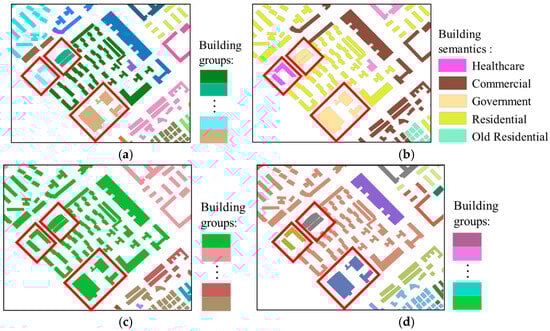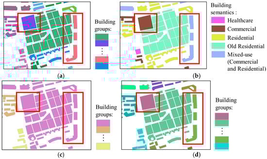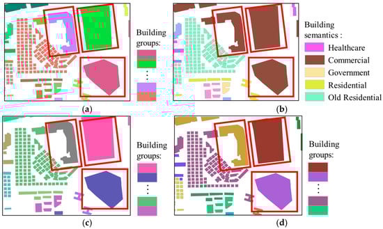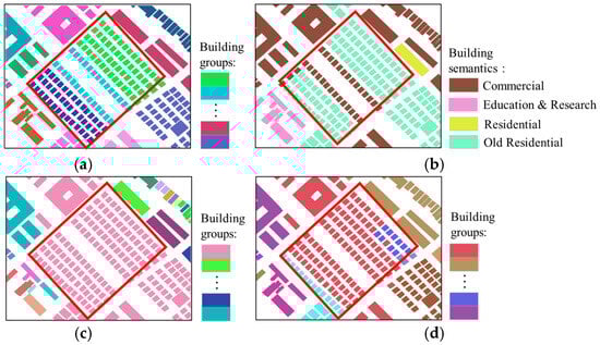 The details of Region B are shown in Figure 8. The buildings in Region B are more densely distributed, and the spatial geometric differences between different building groups are relatively small. Observing the highlighted areas in Figure 8c, since these buildings are similar in shape and orientation to the surrounding buildings or are close in proximity, the initial grouping results of our method classify them into the same group, failing to distinguish them into different scenes accurately. However, after further incorporating semantic features, the highlighted area in Figure 8d shows that buildings with “commercial” semantics and “mixed-use” semantics are separately identified as two independent groups, distinct from other types of buildings. This result demonstrates that our method not only takes into account the spatial proximity between buildings but also fully incorporates their semantic feature differences, ensuring that buildings are precisely classified into their respective groups.