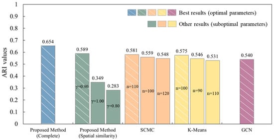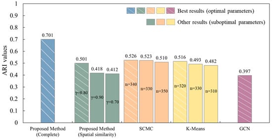 Comparison of ARI values in Experimental Area II: proposed method (optimal parameters) vs. comparative methods (varying parameters), where n denotes the number of clusters, and  denotes the adjustment parameter.